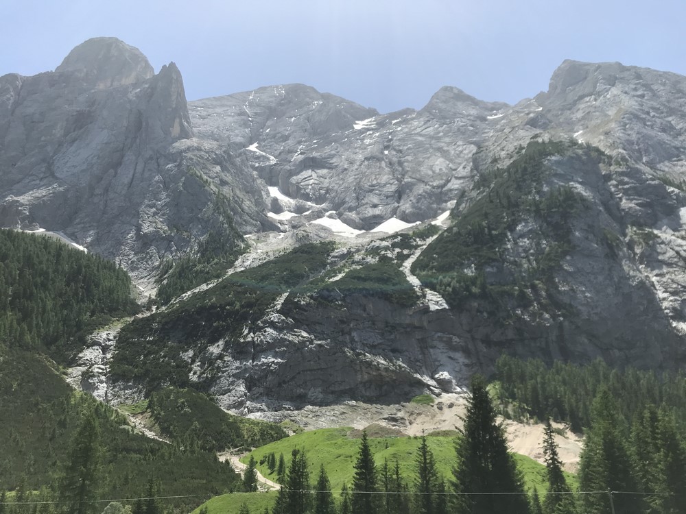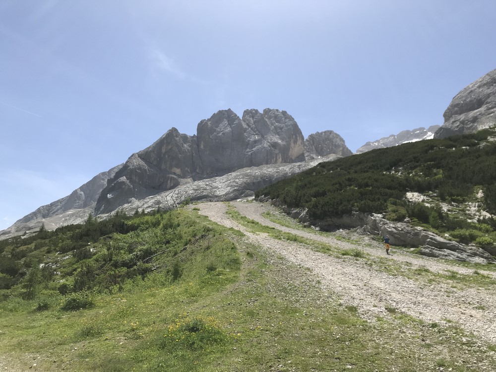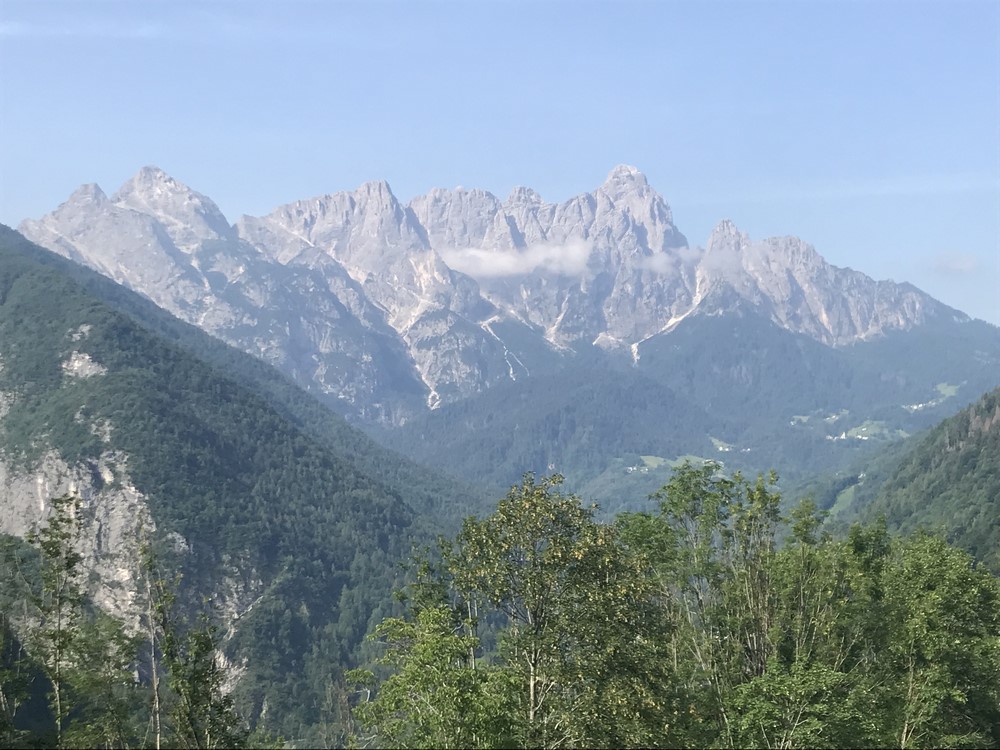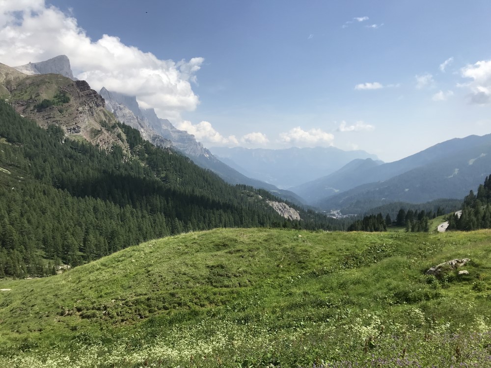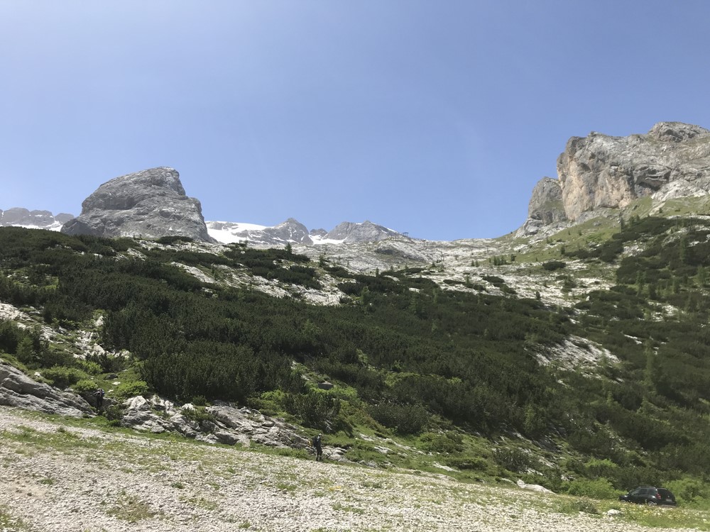 A metà mattina avevo già preso una pausa panino su una bella panchina dell’agordino pertanto la fame non si fa ancora sentire, sono già in discesa dove vedo un piccolo parcheggio sulla sinistra, tre tavoli con panche ancora liberi, occasione giusta e unica, il tempo per parcheggiare il biciclo e sostarmi su una di esse che pure le altre due vengono occupate, sono sotto il sole, a quasi duemila metri di quota si sta bene alzo lo sguardo e sono proprio sotto al massiccio, mi sento un re.