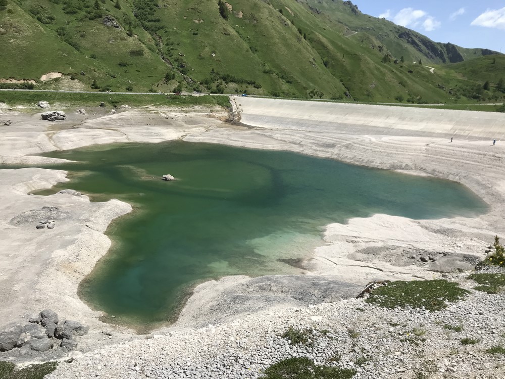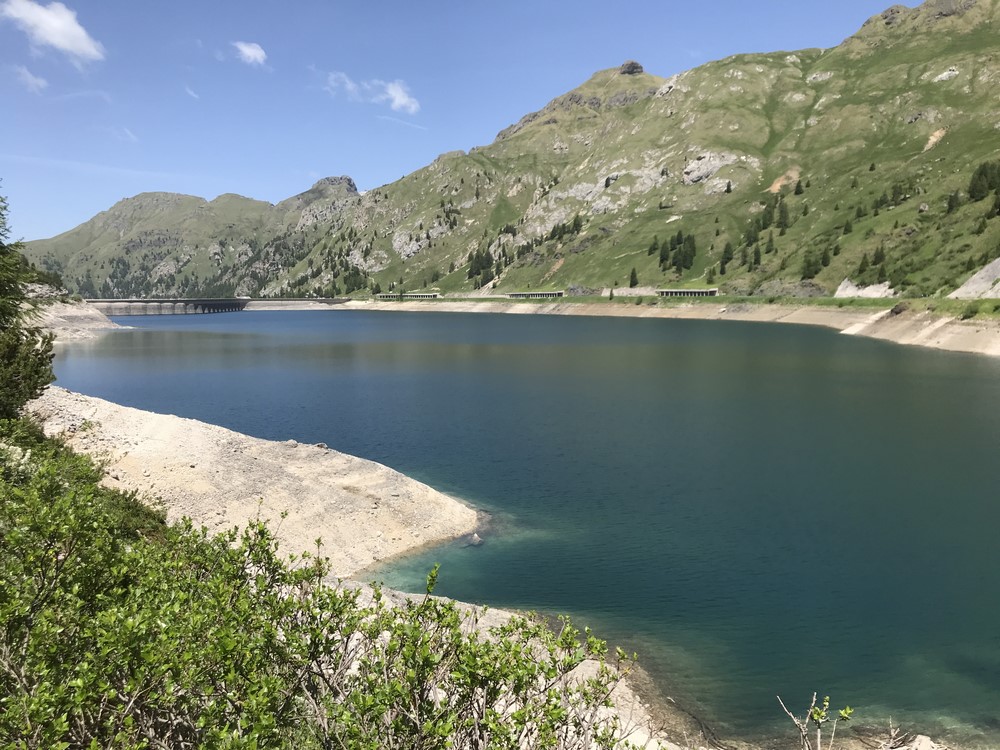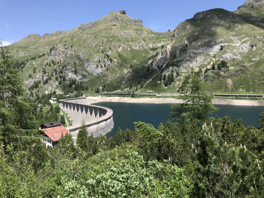 Manco a dirlo il parcheggio al passo è coperto di moto, non mi fermo, la via principale la lascio e continuo la pedalata sulla vecchia strada che costeggia la sinistra del lago, pavimentazione sterrata a tratti asfalto consumato ma esclusivamente ciclabile, meraviglioso anche il panorama vista lago. Arrivato alla diga, la traccia mi fa salire a sinistra su una strada dove ci sono bar e ristoranti, alla vista assai affollati, la via finisce su un grande parcheggio non asfaltato, seguo il gpx per pochi metri fino a trovarmi su un balcone naturale, da un lato sotto di me il lago di Fedaia anch’esso molto ristretto e l’inizio della vallata che va verso valle e dall’altro lato il massiccio della Marmolada dove oramai del ghiacciaio resta alquanto poco, lo spettacolo comunque è da togliere il fiato.