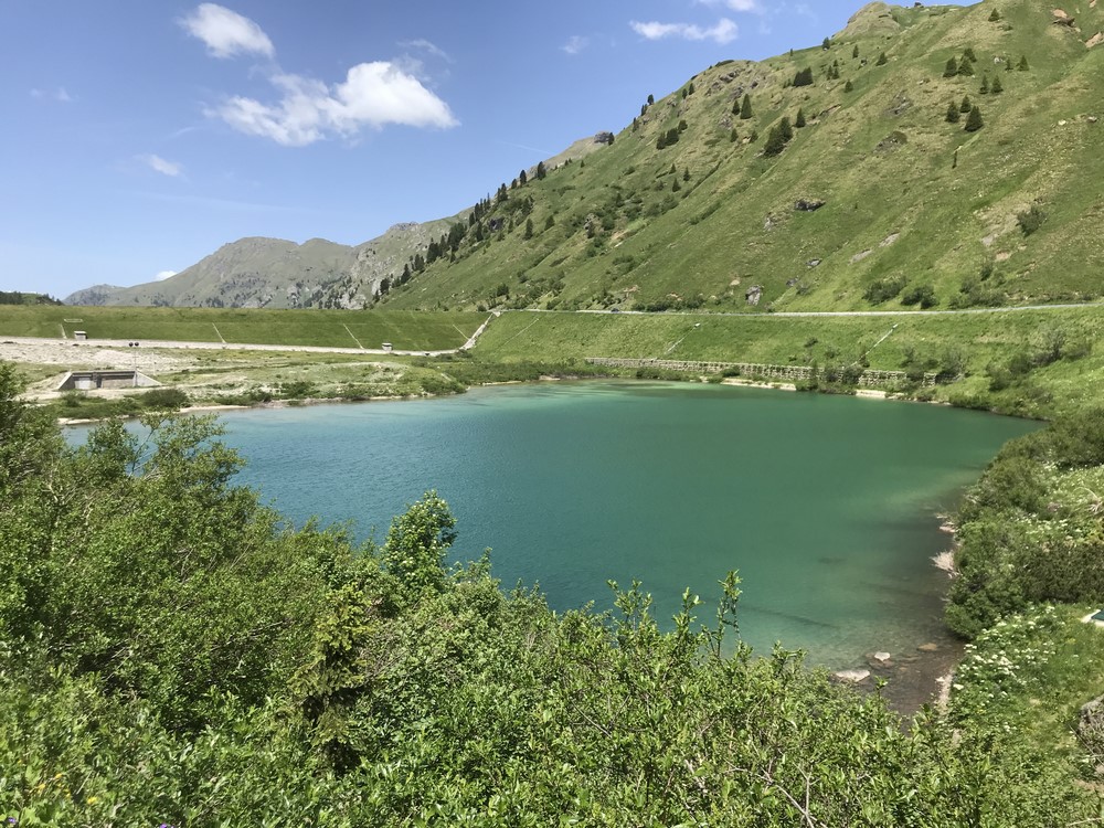 In sette chilometri sono ad Alleghe, il paese sulla sponda di destra lo conosco, salgo dal lato sinistro, brevissimo strappo al 20% e poi la vista lago dall’alto, povero d’acqua, poco più di una grande pozzanghera, sembra di fotografare un malato morente, tristissimo.