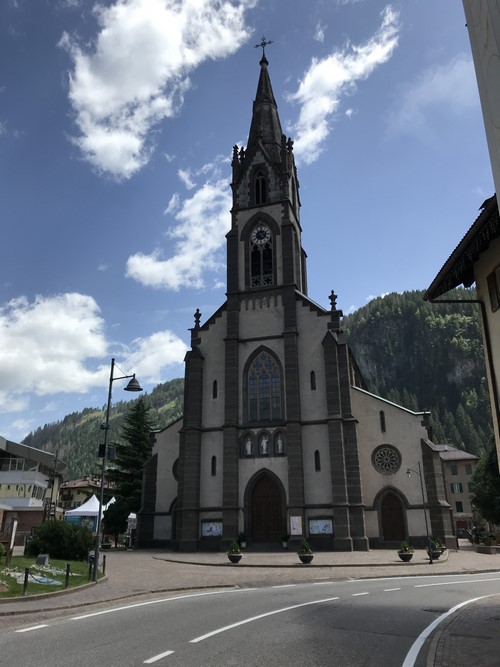 SP641, la strada principale che porta al passo Fedaia è già trafficata, soprattutto veicoli a due ruote, e non sono biciclette, d’altra parte è ben noto, Dolomiti strade da biker. Evito quando possibile la carreggiata maestra e mi inoltro dentro i paesi più caratteristici come Rocca Pietore, un bel borghetto di montagna, bella pure la chiesetta.