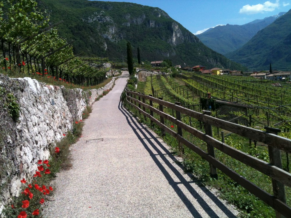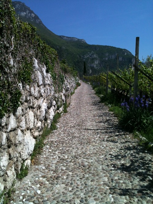 Entro ad Avio e pedalo fra i vicoli stretti del paese, nel passaggio fra Avio e Sabbionara percorro via Olivi, un ciottolato costeggiato da vigneti e gigli selvatici dal colore viola intenso, uno splendore, il vialetto ed i fiori.