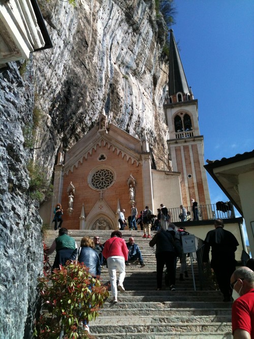 Una fermata programmata in questa piccola località dove si erige uno dei più bei santuari Veneti o forse d’Italia dedicati alla Madonna, il santuario della Madonna della Corona. La stradina che scende al santuario ha un divieto di circolazione alle biciclette, otto minuti a piedi per arrivare alla basilica, ne vale la pena è meravigliosa. Per arrivare alla chiesa sono partito dal centro di Spiazzi e non dal parcheggio dei bus mentre nel ritorno sono risalito per la strada che porta al parcheggio dove ai lati della stessa ci sono posizionate le statue in bronzo a grandezza naturale raffiguranti le stazioni della Via Crucis di Cristo, emozionante.