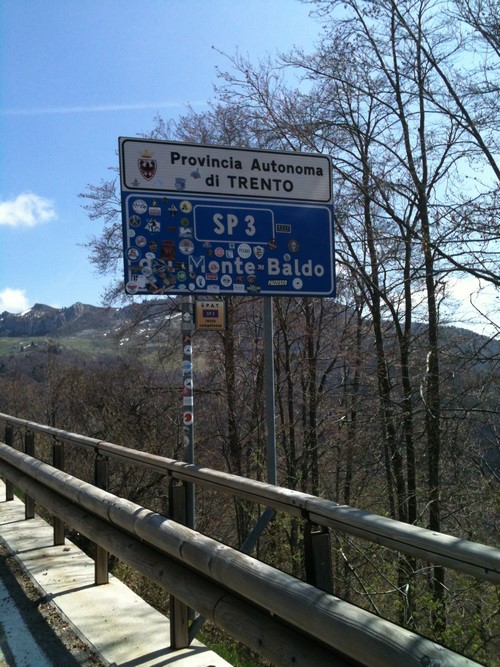 Dal parcheggio intasato dai bus scendo a Spiazzi e giro su una curva a gomito a destra, nella strada in salita mi trovo sulla sinistra l’area montuosa del Baldo. Sette chilometri passando per il sacrario del monte Baldo e il villaggio Alpino prima di iniziare a pedalare sulla SP8 la provinciale del monte Baldo.