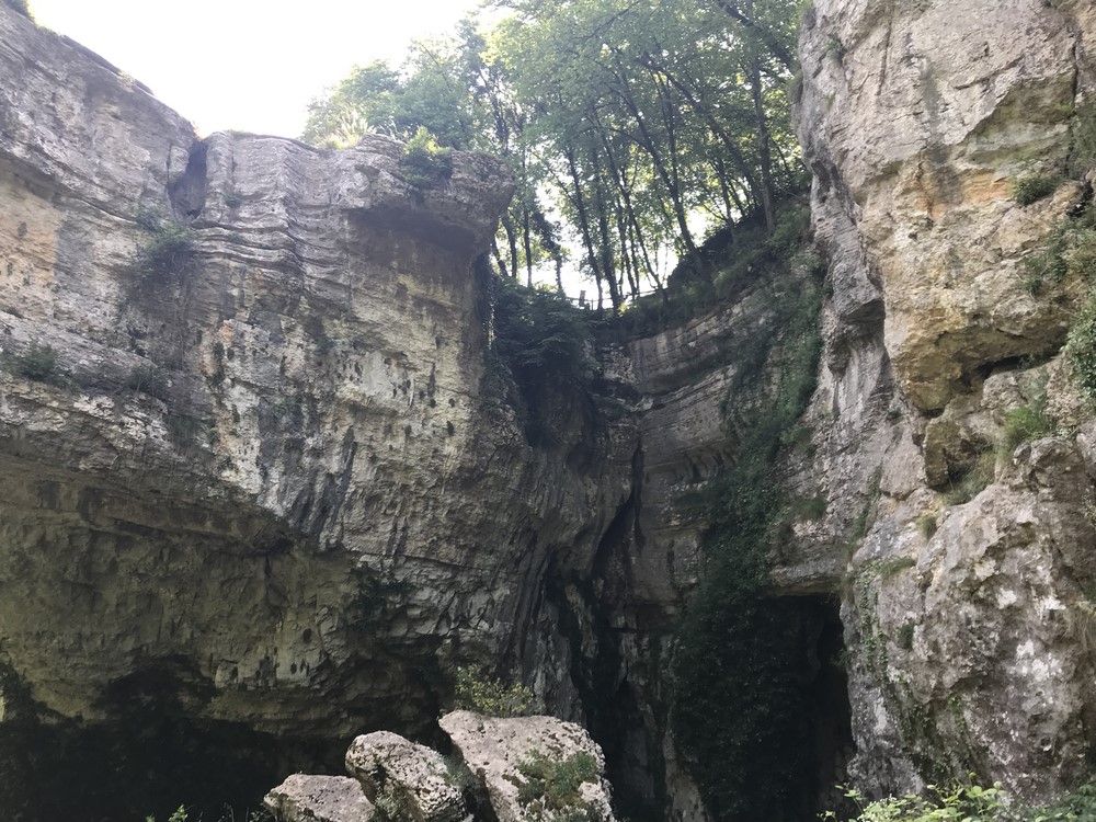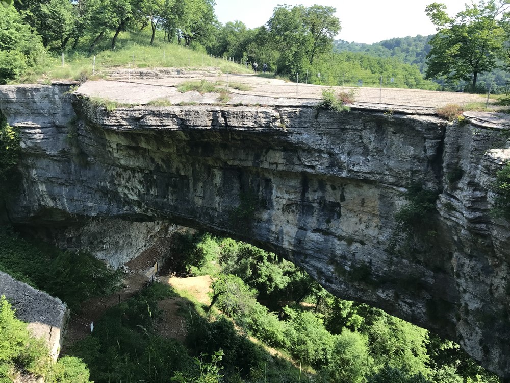 Sul piazzale un piccolo carro armato, un bar sulla destra dove parte un breve sentiero percorribile in bicicletta fino alla sommità del ponte, scendo su un piccolo sentiero senza bike e mi trovo uno spettacolo della natura unico, un arco in pietra calcarea lungo circa quaranta metri e spesso nove che passa sopra a due torrenti, il Crestena ed il Fenile, qualche foto prima di risalire in sella per proseguire il viaggio.