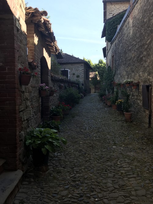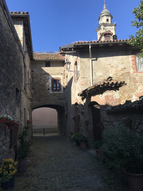 Castelletto d’Orba, bellissimo borgo medievale, con le tre parrocchie e le sue quattordici chiese è incantevole. Per arrivarci ho percorso un piccolo tratto di strada sterrata, trecento metri di fondo liscio e senza buche, il viaggiare con una bicicletta gravel mi toglie i limiti che altrimenti avrei nel pedalare su una road bike.