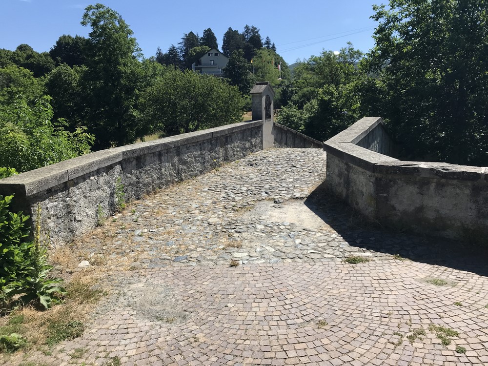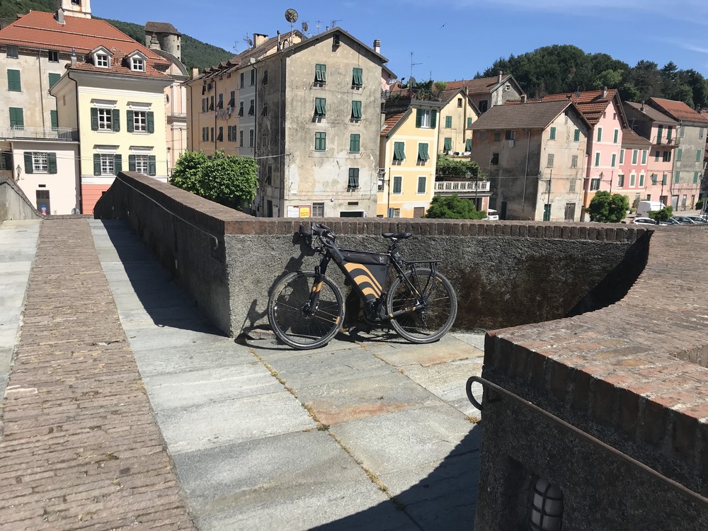 Il viaggio continua e sebbene l’altitudine di queste montagne non sia elevata arrivo al primo valico, Passo Bric Berton quota 762 m., discese e salite brevi continue pedalo all'interno della foresta della Deiva che fa parte del Parco Regionale del Beigua. Prima di arrivare a Pontinvrea entro nel centro di Sassello una foto al ponte romano ed un rifornimento idrico su una fontana di acqua fresca.