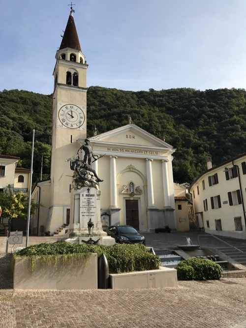Ripassando il Piave a Fener sono tornato a pedalare nella SS48, tre chilometri prima di svoltare a destra ed entrare a Pederobba. Corro poco nella via principale che guarda a sud scegliendo le strade interne sotto monte. Pedalo sulle stradine di Virago, Granigo, Caniezza, Obledo fino a passare nel grande piazzale sotto il tempio del Canova a Possagno. Poca strada percorsa nella principale SP26, tutte le viuzze mai percorse prima rendono il viaggio assai piacevole e divertente.