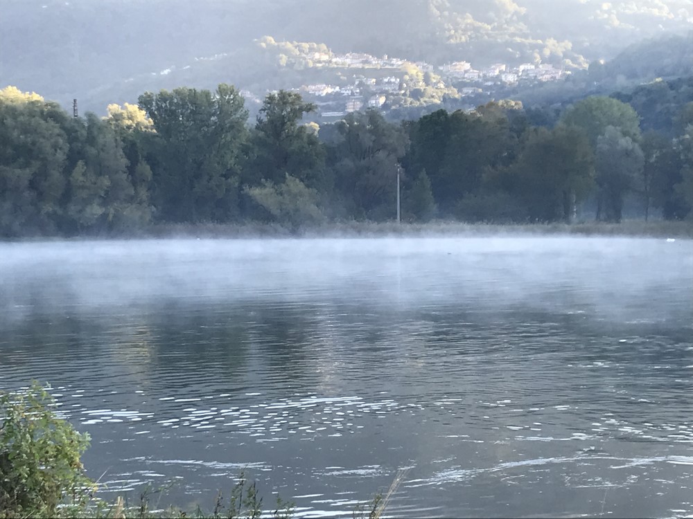 Poco distante accompagno per un breve tratto degli atleti che hanno appena effettuato la partenza in una corsa podistica e poi Brusicco, Carvico, Monte Cucco, Villa d’Adda prima di passare il ponte di Brivio, da qui inizio a pedalare su strada bianca battuta che corre lungo il fiume Adda, il panorama è fantastico, nelle prime ore del mattino il sole si alza dietro gli alberi e riscalda il corso lento d’acqua creando il vapore acqueo che si alza dal fiume, la luce della stella genera mille riflessi nello specchio liquido, tutto va piano, molti fotografi sul lungo fiume fermano con gli scatti i vari momenti dell’alzarsi del sole che ogni minuto fa cambiare la visuale sul fiume, ora la bicicletta si ferma, pochi secondi per lo spettacolo offerto dalla natura è il tempo necessario per fissare in digitale qualche immagine.