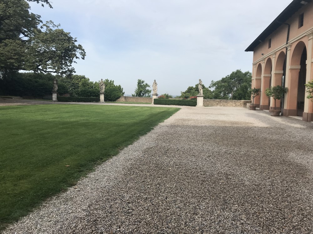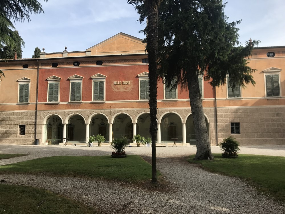 Sotto lo sguardo attonito del guardiano entro con la bici nel secondo sito che visito a Cavriana, villa Mirra, un edificio risalente al '500 di proprietà dei Gonzaga ma rifatta nel XVIII secolo dagli austriaci e in seguito acquistata dalla famiglia Mirra. La villa è molto bella ed è circondata da un parco impreziosito da cipressi, querce, palme, grandi cedri del Libano e molte altre tipologie di piante.