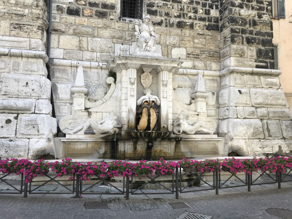 Un semicerchio in senso orario prima di arrivare alla chiesa di Santa Maria del Carmine e dopo poche decine di metri alla fine del vicolo delle Due Torri trovo la Pallata una torre del XIII secolo tutta costruita in pietra dove alla base di questa sul lato di via Mameli si trova la fontana dei Fiumi detta anche fontana della Pallata.