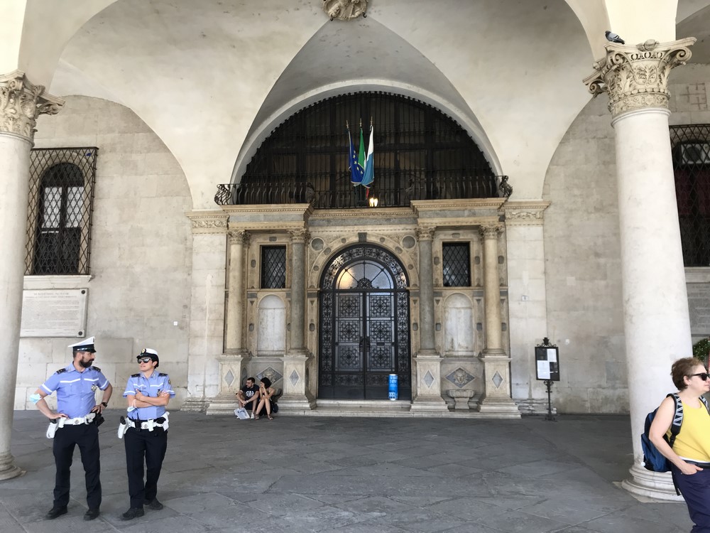 La piazza è molto bella tutta circondata da palazzi antichi, oltre al palazzo della Loggia sede del Comune di Brescia vedo dominante dalla parte opposta la torre dell’Orologio, il manufatto risalente alla metà del XVI secolo dove all’interno alloggia un orologio astronomico meccanico, sulla sinistra della torre piazza Bell’Italia con il suo monumento dedicati ai caduti delle dieci giornate di Brescia.