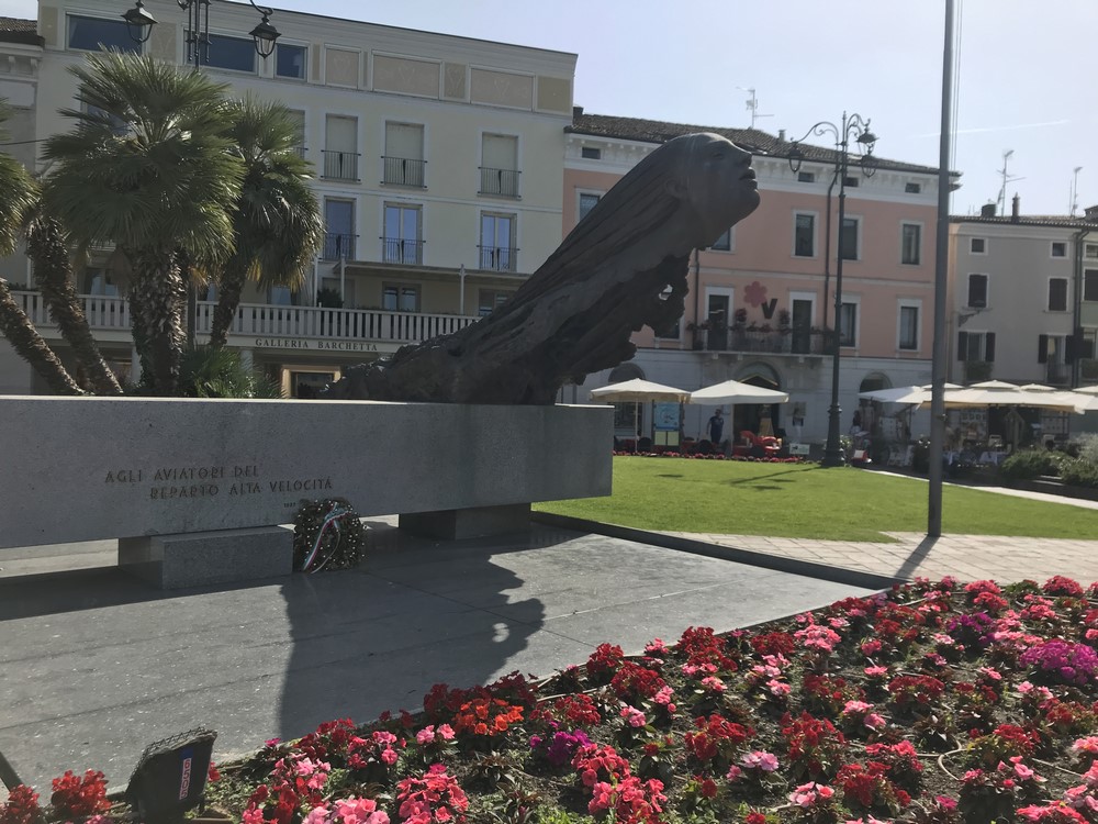 Pedalando ancora sulla tratta collinare distaccata dalla trafficata gardesana arrivo a Desenzano sul Garda, sulla piazza Cappelletti in fronte lago il monumento alla memoria antifascista che Mario Gatti inaugurò nel 1964, anche il monumento dedicato agli Aviatori del Reparto Alta Velocità inaugurato nel 1967 è molto bello. Il RAV è un reparto con una grande storia che consiglio di cercare e leggere, interessante il record mondiale di velocità con 709,209 km/h pervenuto nel 1934 e conquistato dal maresciallo Francesco Agello.