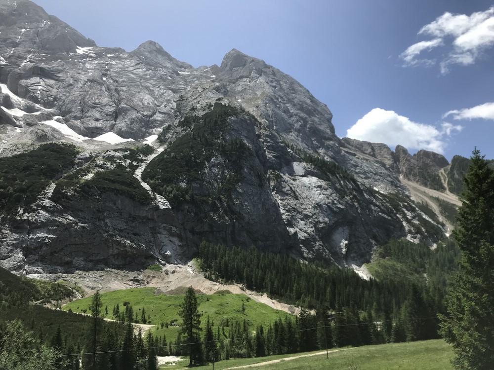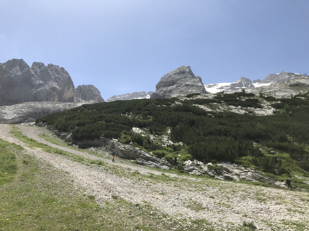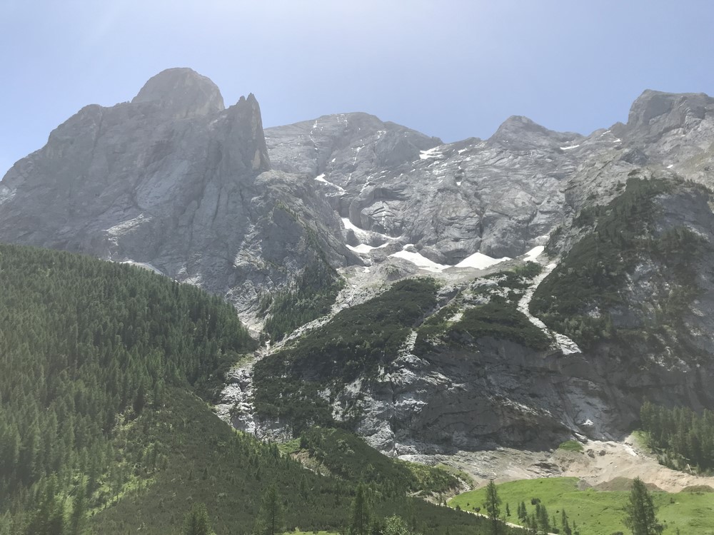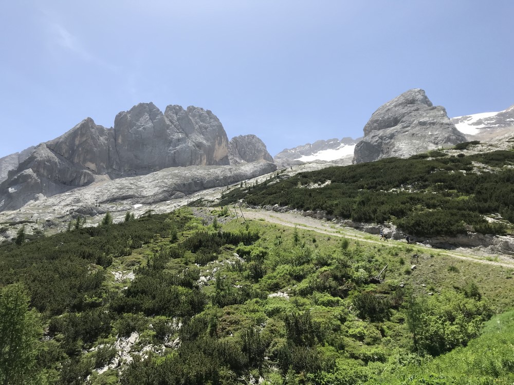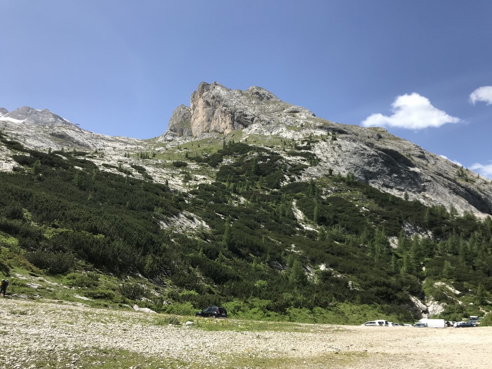 A metà mattina avevo già preso una pausa panino su una bella panchina dell’agordino pertanto la fame non si fa ancora sentire, sono già in discesa dove vedo un piccolo parcheggio sulla sinistra, tre tavoli con panche ancora liberi, occasione giusta e unica, il tempo per parcheggiare il biciclo e sostarmi su una di esse che pure le altre due vengono occupate, sono sotto il sole, a quasi duemila metri di quota si sta bene alzo lo sguardo e sono proprio sotto al massiccio, mi sento un re.