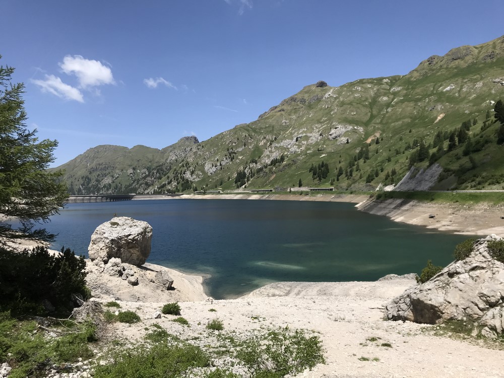 Manco a dirlo il parcheggio al passo è coperto di moto, non mi fermo, la via principale la lascio e continuo la pedalata sulla vecchia strada che costeggia la sinistra del lago, pavimentazione sterrata a tratti asfalto consumato ma esclusivamente ciclabile, meraviglioso anche il panorama vista lago. Arrivato alla diga, la traccia mi fa salire a sinistra su una strada dove ci sono bar e ristoranti, alla vista assai affollati, la via finisce su un grande parcheggio non asfaltato, seguo il gpx per pochi metri fino a trovarmi su un balcone naturale, da un lato sotto di me il lago di Fedaia anch’esso molto ristretto e l’inizio della vallata che va verso valle e dall’altro lato il massiccio della Marmolada dove oramai del ghiacciaio resta alquanto poco, lo spettacolo comunque è da togliere il fiato.